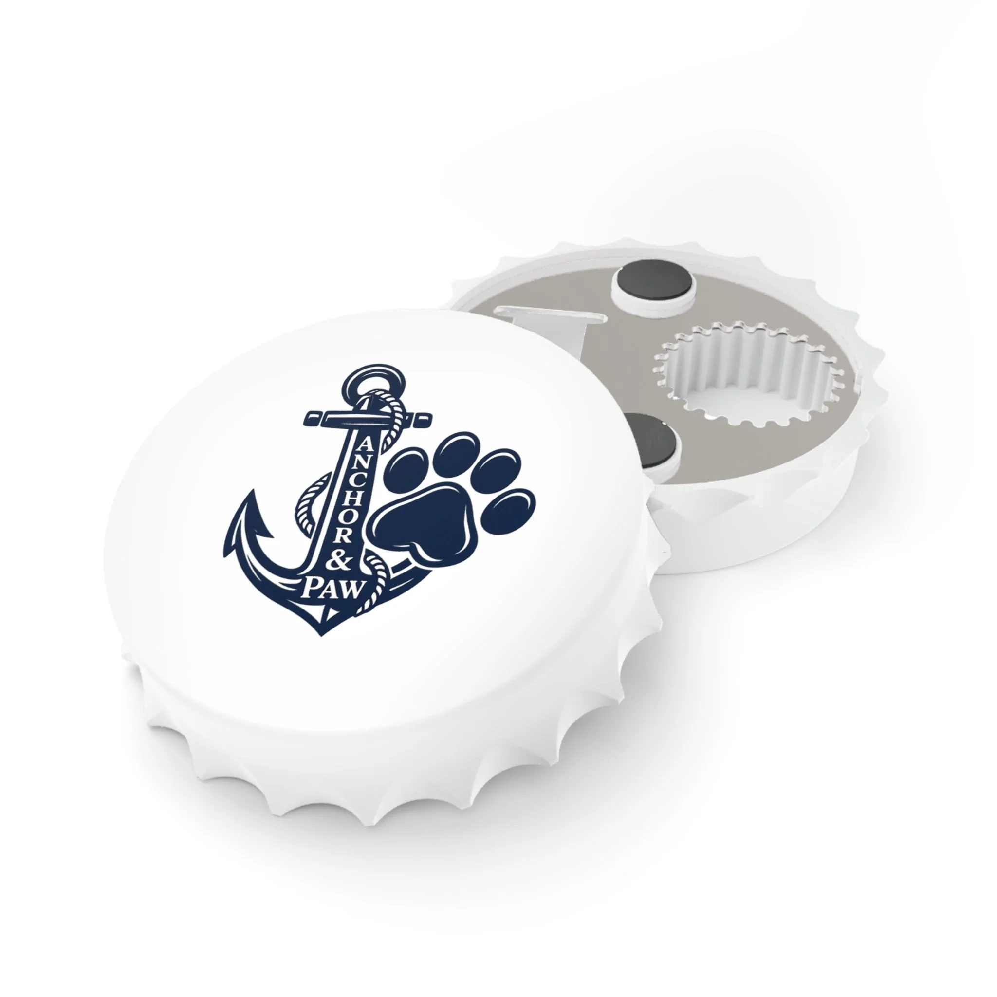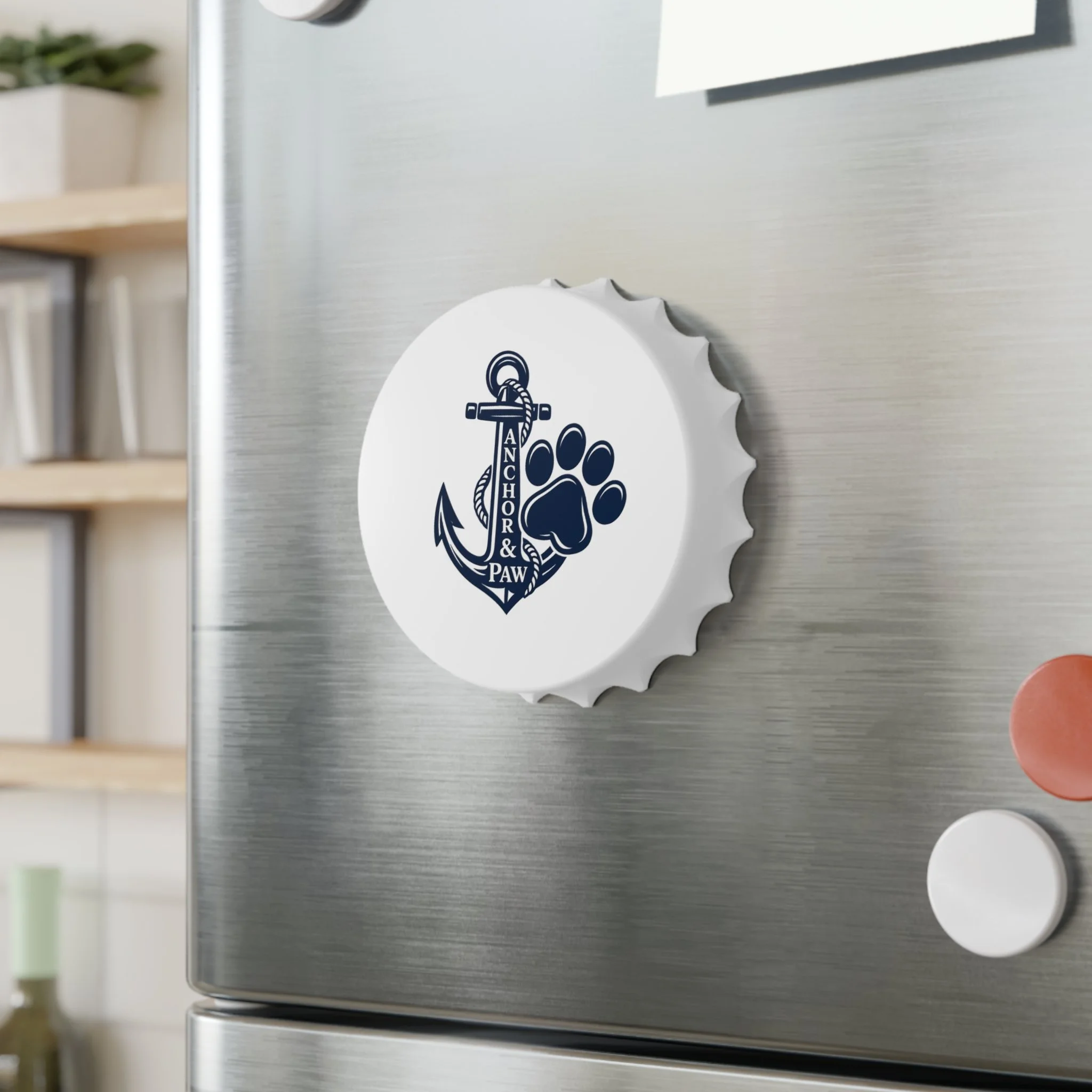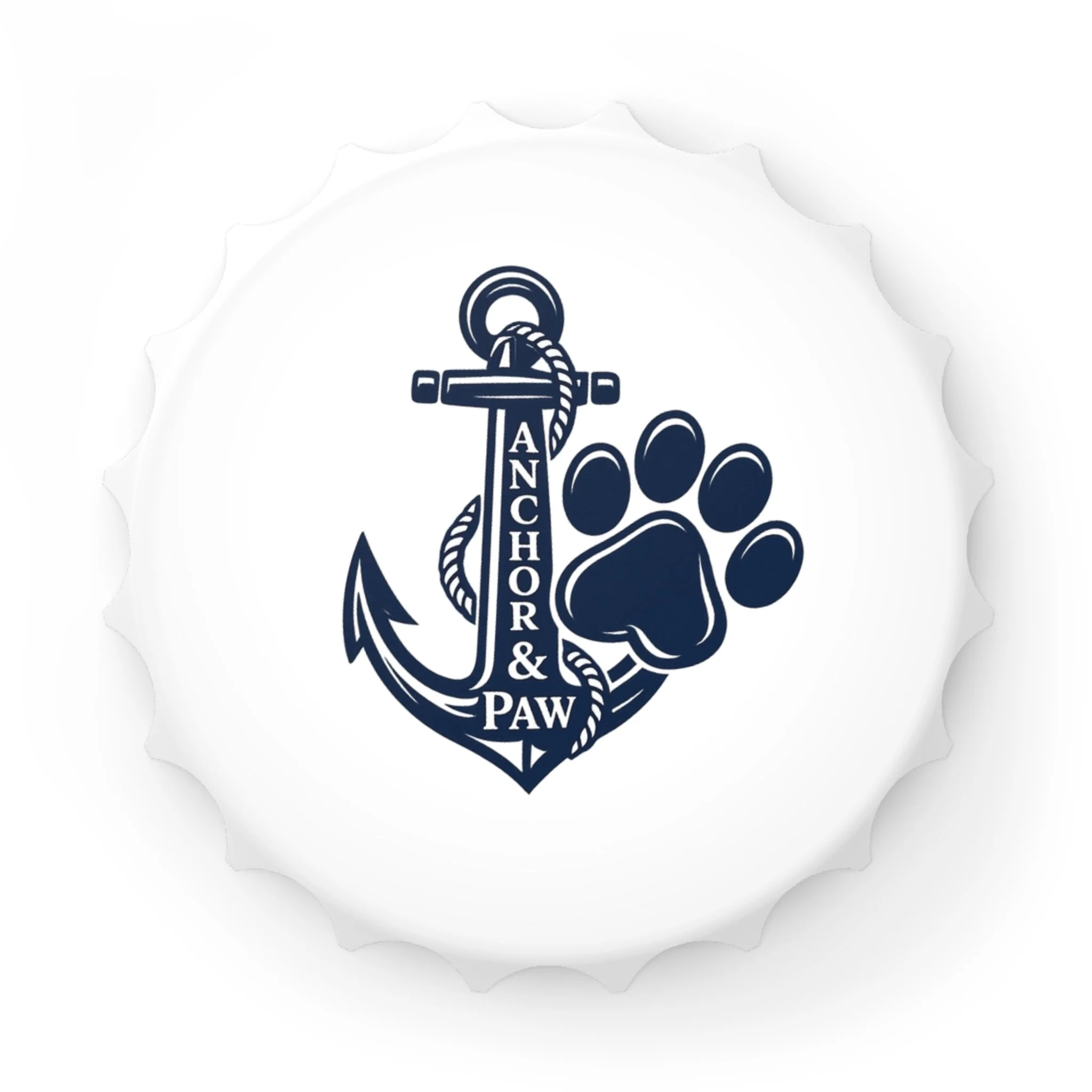 Lightweight and sturdy, this bottle opener brings a dash of sea-side charm to any fridge or bar cart. One side shows a crisp, matte-printed anchor and paw design in deep navy — a quiet tribute to dog lovers who live for coastal walks and sunsets. Flip it over to reveal two practical opening mechanisms and two strong magnets that hold the opener firmly to metal surfaces when not in use. At about 3 inches wide, it fits comfortably in hand and works on standard crown caps with minimal effort. Made from a durable polycarbonate shell and metal body, it’s built for evenings spent on the porch, boat decks, or by the firepit with friends and furry companions.
